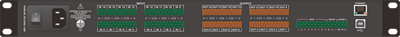 E-D2424是一款24进24出的自动混音矩阵,配备24路模拟输入和24路模拟输出,内置反馈抑制,自动混音,矩阵混音,均衡器,分配器,压缩器等DSP功能,支持Dante网络音频功能扩展,通过USB免驱连接电脑软件控制或RS232/TCPIP连接中控远程控制,适合用在各种场合的扩音工程。